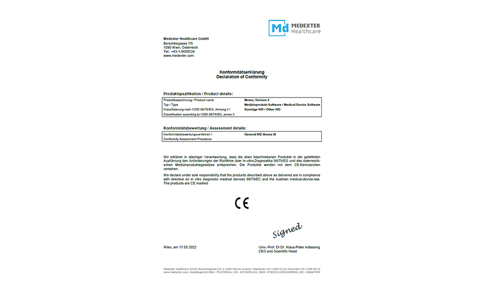 May 17, 2022 Momo Is Declared a Medical Device in Accordance with the EU IVD Directive 98/79/EC! Momo received a declaration of conformity for the EU IVD Directive 98/79/EC. It is now a declared medical device and CE (Conformité Européenne) marked, indicating that...