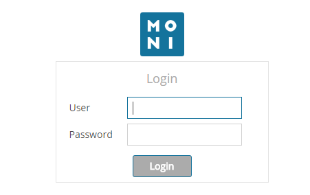 The first screen you will encounter is the login screen. Before Moni can be used, you need to login with your user name and password. After logging out or if you are idle for 15 minutes or longer, Moni will automatically log you out and return to the login screen.