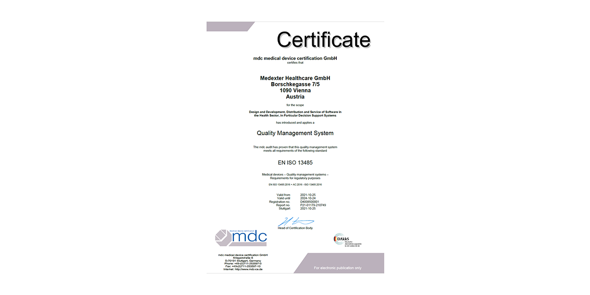 The annual surveillance audit by mdc medical device certification GmbH for the confirmation of the DIN EN ISO 13485 certification has been successful. Medexter has thereby confirmed that its quality management system still meets all necessary regulatory requirements to design and produce medical devices.
