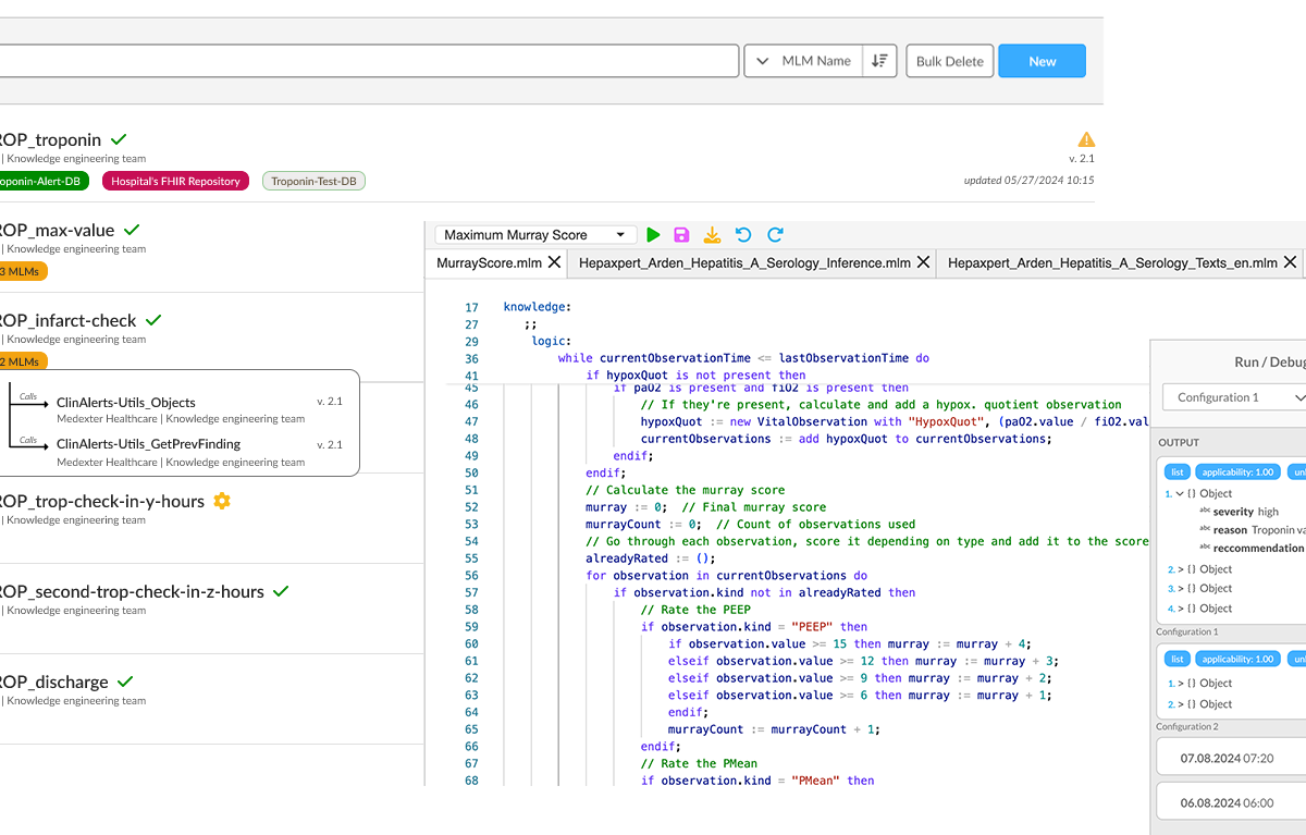 Clinically proven knowledge packages (MLMs) written in Arden Syntax (rules, tables, guidelines, interpretations, reminders, alerts, recommendations, scores, adverse events, or other custom-made content).