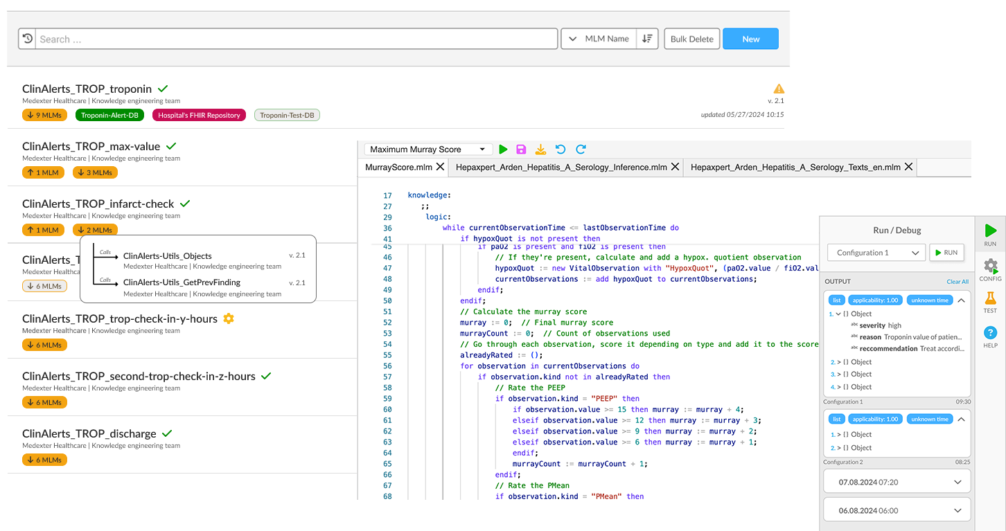 Clinically proven knowledge packages (MLMs) written in Arden Syntax (rules, tables, guidelines, interpretations, reminders, alerts, recommendations, scores, adverse events, or other custom-made content).