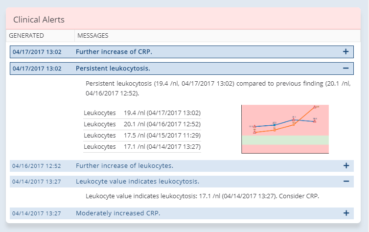 Alerts for leukocyte, CRP, and hemoglobin abnormalities.