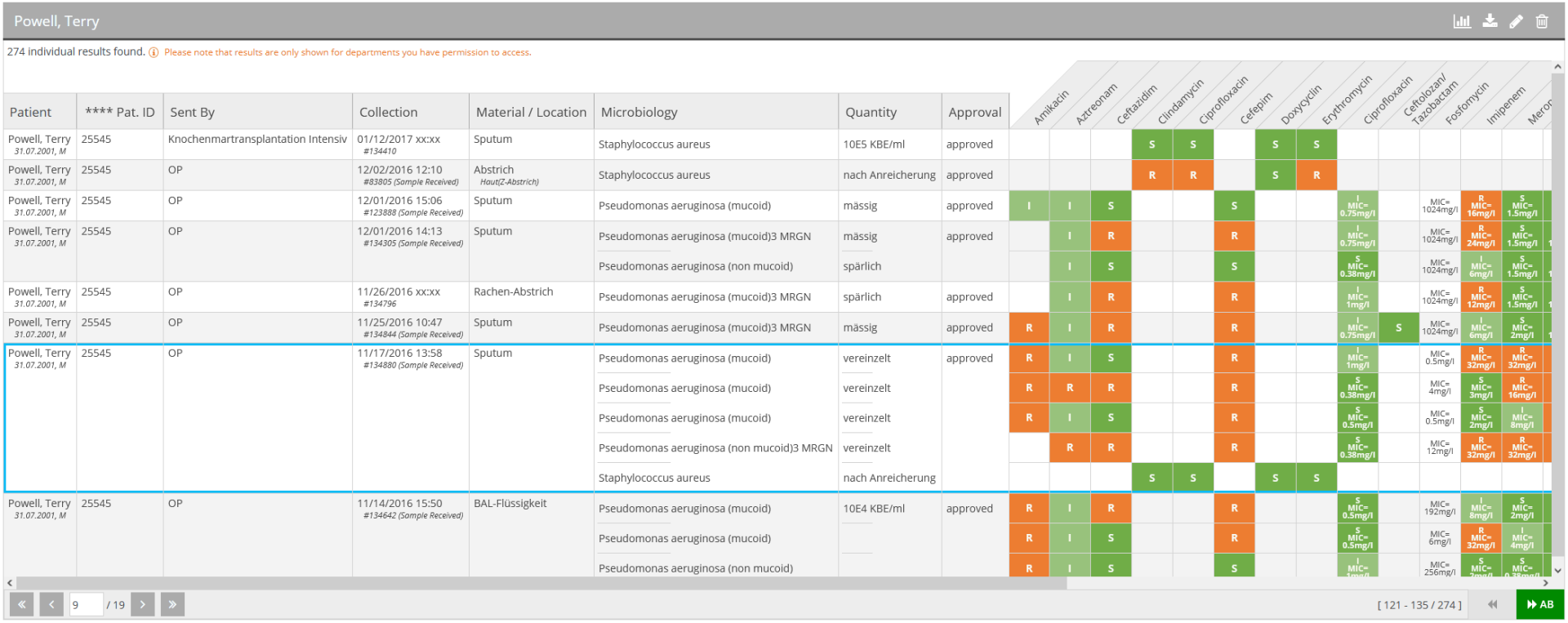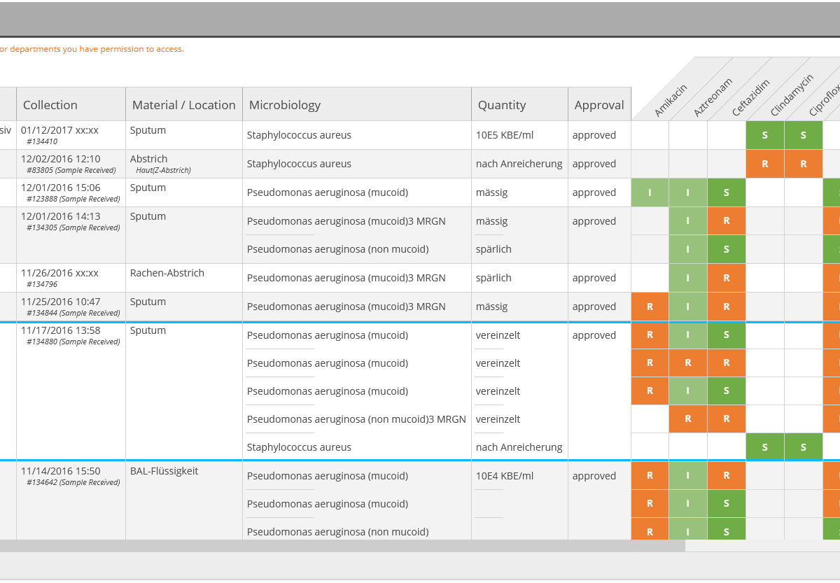 Given a particular patient or ward, Momo OneClick immediately retrieves all microbiological data from this patient or ward and presents it in a dense, yet clear and attractive graphical form. Alert-worthy findings can be emphasized.